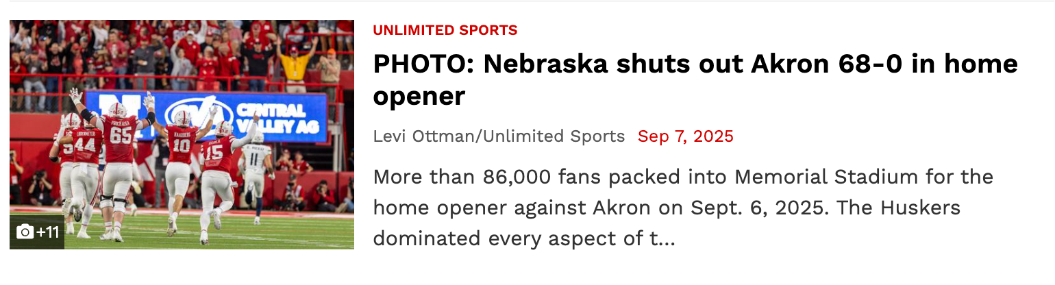 I had the opportunity to photograph and write a photo story over Nebraska's 2025 home opener against Akron for one of my classes, Unlimited Sports. My article was posted on Nebraska News Service, which is a student-run news operation from the University of Nebraska-Lincoln College of Journalism and Mass Communications' Experience Lab.